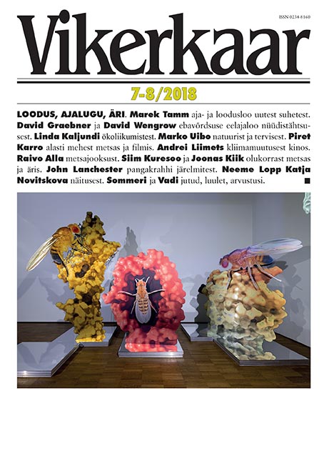 LOODUS, AJALUGU, ÄRI. Marek Tamm aja- ja loodusloo uutest suhetest. DavidGraeber ja DavidWengrow ebavõrdsuse esiajaloo tähtsusest. Linda Kaljundi uusmetsikust Eestist. Marko Uibu natuurist ja tervisest. Piret Karro alasti mehest metsas ja filmis. Andrei Liimets kliimamuutusest kinos. Raivo Alla metsajooksust. Siim Kuresoo ja Joonas Kiik olukorrast metsas ja äris. John Lanchester pangakrahhi järelmitest. Neeme Lopp Katja Novitskova näitusest. Lauri Sommeri ja Urmas Vadi jutte, Sylvia Plathi, Mart Kanguri, Yolanda Castaño ja Kristel Rebase luulet. Made Luiga Kai Kasest, Keiu Virro Neoon Mustast, Pille-Riin Larm Jan Kausist, FS Villem Valmest, Daniele Monticelli semiootikast, Alari Allik Mikitast. Ave Taaveti joonistused.