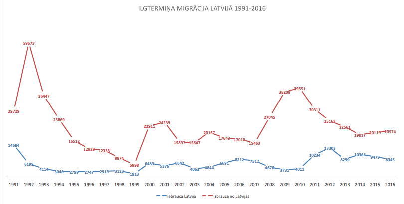 Joonis 1. Pikaajaline migratsioon Lätis 1991–2016. Allikas: Läti Vabariigi statistika keskvalitsus. Sinine kõver: Lätisse saabunud; punane – Lätist lahkunud.