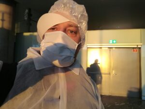 Hotelli sisenedes pakuti „1 tilk ohutust“ desinfitseerimisvahendi näol. Ja mina – saabusin kalatööstuse kolleegidelt saadud ühekordse kitli, mütsi ja maskiga. Naljakas? Kindlasti. Aga ohutu ja marginaalselt kasulik.