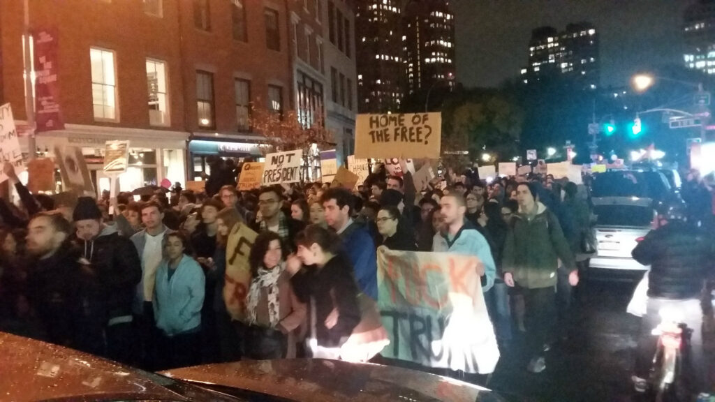 Esimesed protestid toimusid kolmapäeva õhtul, Berkeleys ja New Yorgis (kindlasti veel paljude teisteski kohtades). Union Square’il kogunenud tuhanded meeleavaldajad marssisid kell kaheksa õhtul Trump Toweri juurde ja skandeerisid “mitte meie president”. Tulevane president Trump vastas päev hiljem Twitteris: “Ma lõpetasin just väga avaliku ja eduka presidendikampaania. Nüüd meedia poolt õhutatud professionaalsed protesteerijad protesteerivad. Väga ebaaus!”
