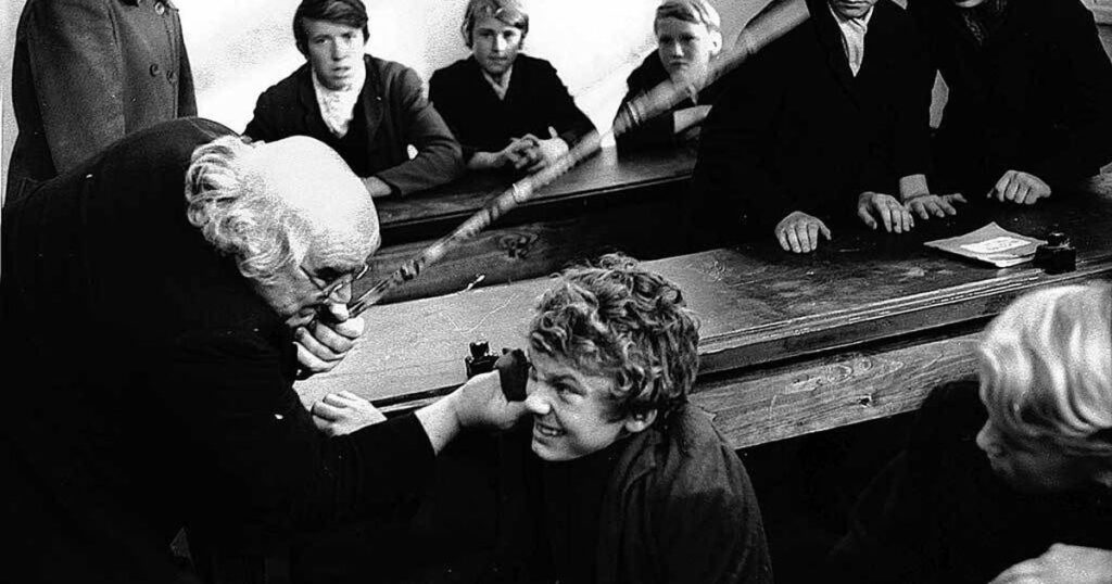 „Ja siis ma näen asju, mis mind lausa kohutavad. Uuk jookseb klassi, käes kimp vitsu: „Kes siin karjus nii koledasti? … Ah sina see olidki! Tule siia ahju juurde!“ ……