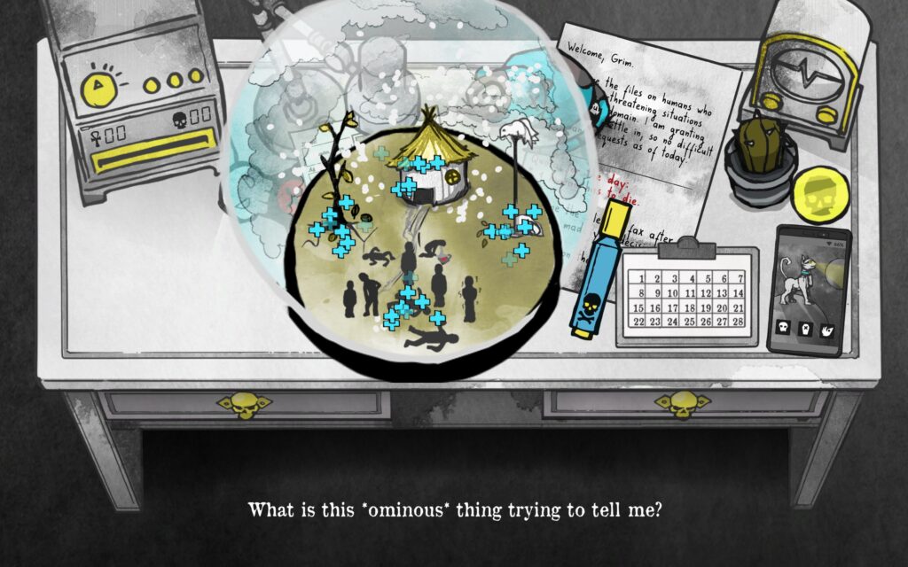 Teine asi, mille kallal tahaksin pisut norida, on mängusisene pinge. Üksikute Surma langetatud valikute ja nende tagajärgede vahel on see üldiselt hästi välja mängitud, sageli otse vastupidine oodatud tulemusele, kuid mänguterviku kontekstis liiga ühetasane. Eri mängu-etappide / tööl oldud nädalate lõikes oleks valikute langetamise raskusaste võinud järsemalt kasvada. Kui just rutiinse kontoritöö igapäevaste korduste esitamine ei olnudki arendajate teadlik valik. Eriti pikema mängusessiooni jooksul jõuab tekkida tunne, et kõik valikud ja päevad on sama kaaluga. Näiteks oleks võinud suureneda läbitöötamist vajava info hulk, samaväärsete valikute rohkus või keerukamad tööjuhendid Saatuselt.