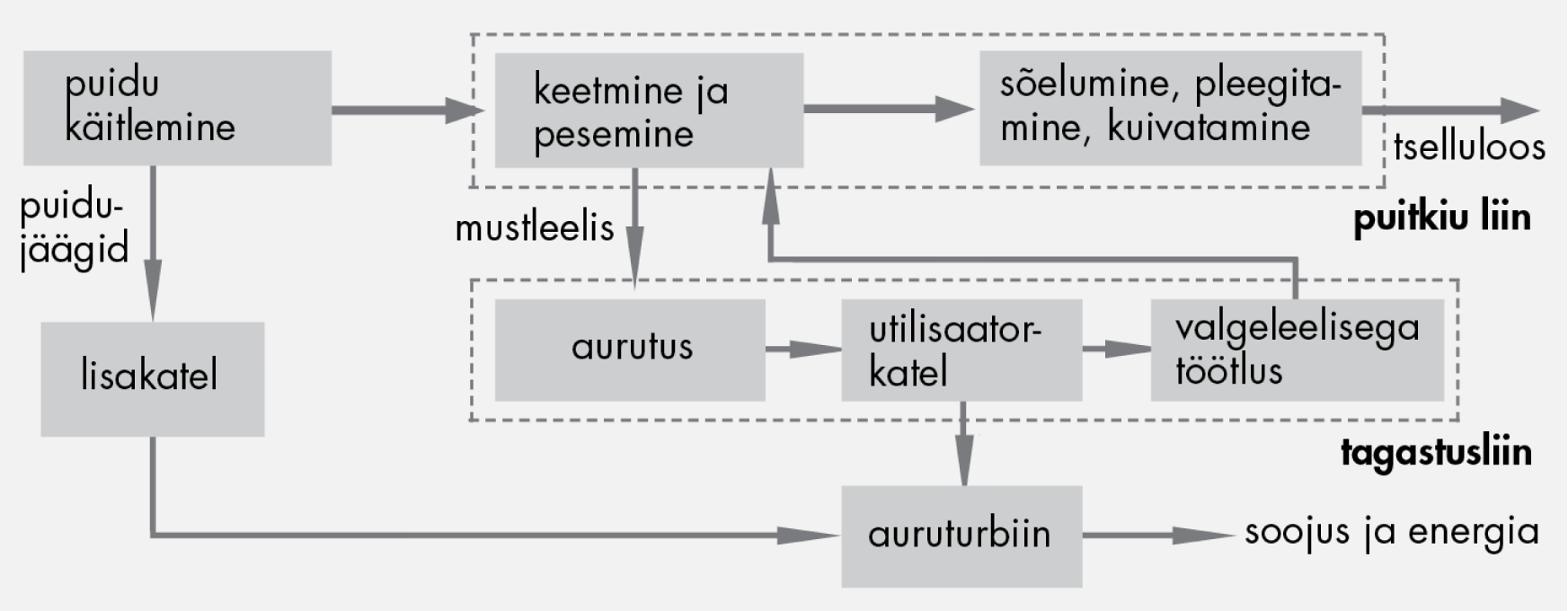 (Joonis M. Cardoso, M. Hamaguchi ja E. Vakkilaineni artikli põhjal „Alternative Technologies for Biofuels Production in Kraft Pulp Mills – Potential and Prospects“. Energies, detsember 2012.)