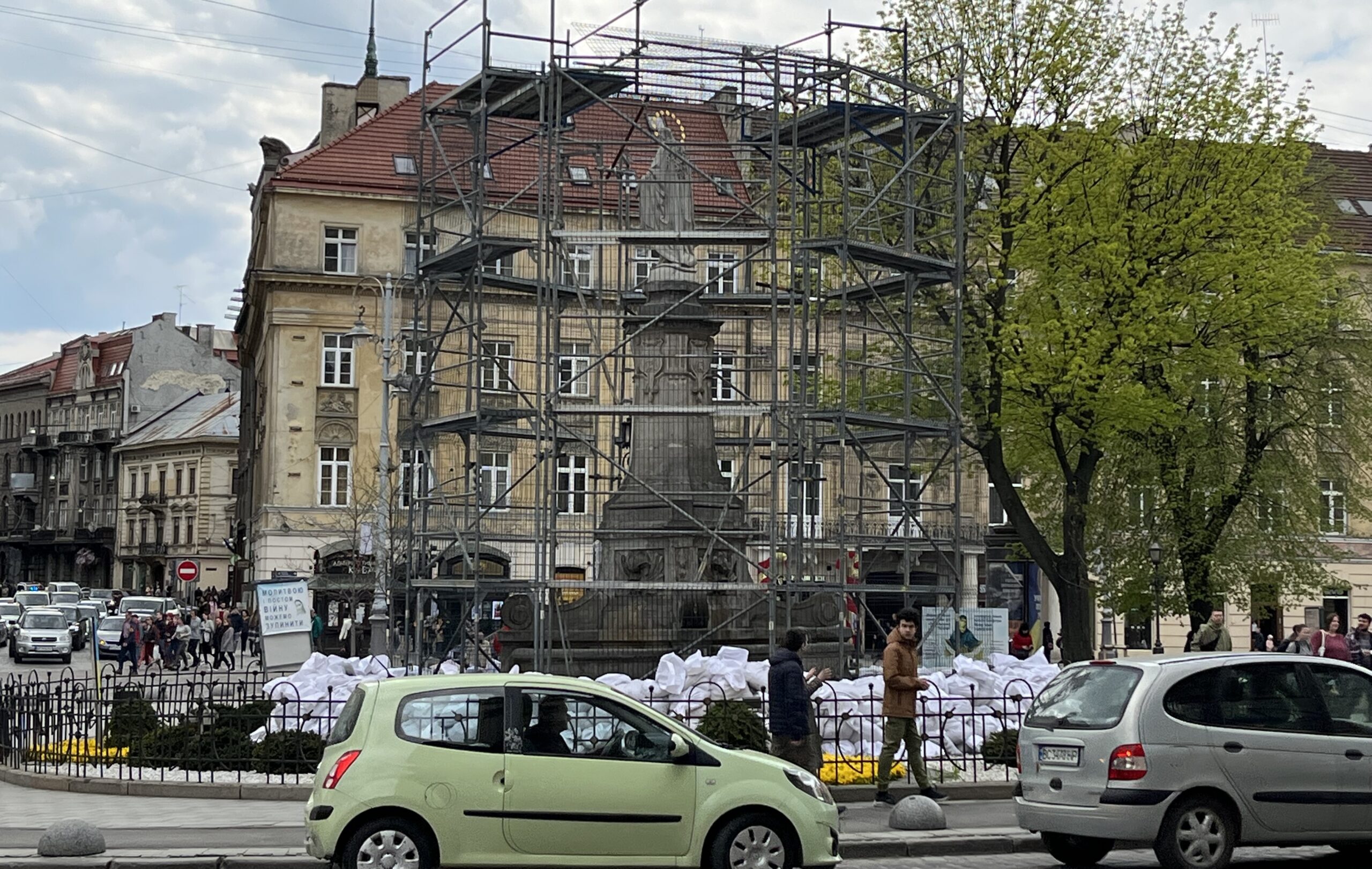 Tegelikult pole UNESCO maailmapärandi hulka arvatud kesklinn siiski päris endine: kirikute aknad on kinni kaetud, esimestel korrustel täidavad neid liivakotid. Keskväljakul, Ploštša Rõnokil, on raekoja neljas nurgas asuvad skulptuurid – Diana, Adonis, Neptun ja Amphitrite – kilesse mässitud ja seejärel peidetud metallkastidesse.