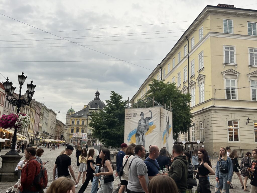 Kas linnapilt oli feminiinne? Ei tundunud nii, noori mehi oli liikvel täitsa palju. Võib-olla veidi vähem kui naisi, aga kelnereid ja baarimehi ikka jagus. Erinevalt eelmisest aastast liikus nüüd linna peal ringi ka ühe jala või käega noori mehi, mõni neist sõdurivormis. Lvivi raekoja ees oli kaks mälestustahvlit äsja surma saanud poiste piltidega, mõlemad 90ndatel sündinud. Peetruse ja Pauluse kirikus olid suured fototahvlid hukkunud kohalikega, aga Danilo Halitski kuju vastas asunud lillemüür, tehislilledest ja hukkunute piltidest kokku pandud Ameerika tudengi installatsioon oli mõne aja eest maha võetud. Palju oli nii linnapilti kui ka galeriidesse ja kirikutesse üles pandud laste joonistusi, seda tendentsi ma aasta eest ei märganud.