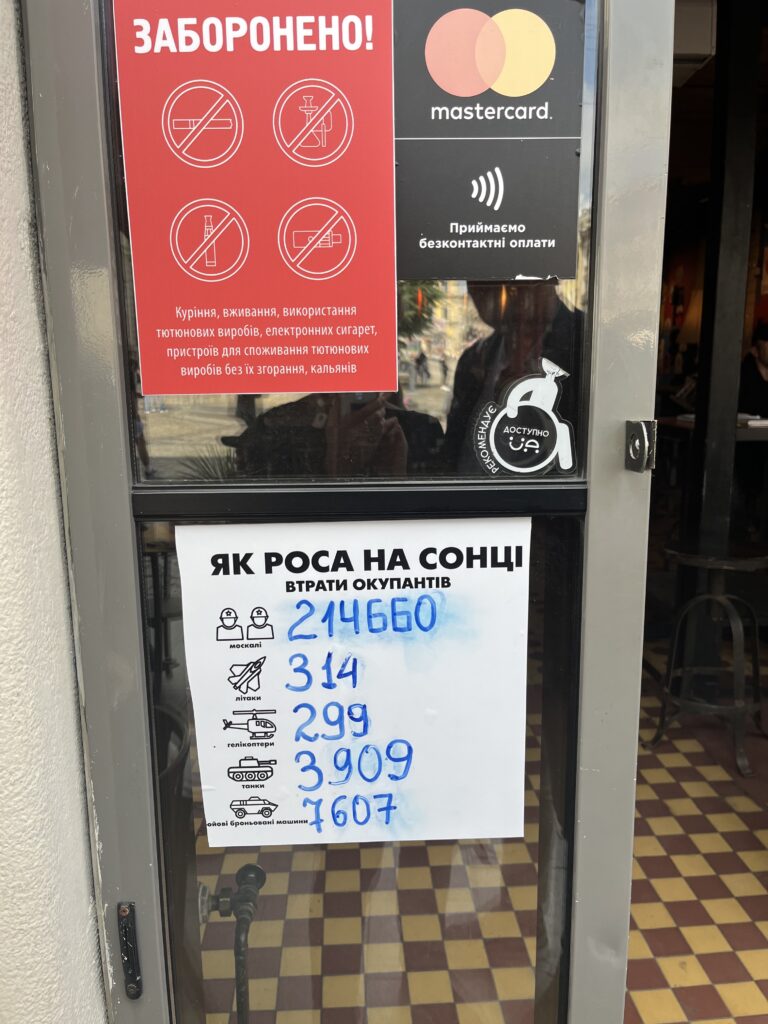 Mõistagi on Pravda õlleteater vahepeal juurde tootnud kõikvõimalikke võitluslikke sõjaõllesid. Baari ukse peal on neil kirjas, kui palju on Vene väed selleks kuupäevaks kaotusi kandnud. Numbrite kohale on kirjutatud “як роса на сонці”, see on rida Ukraina hümnist, kus on öeldud, et “meie vaenlased kaovad nagu kaste päikese käes”. Selleks päevaks, kui me lõpuks Lvivis ära sõitsime, st 10. juuniks, olid need numbrid niisugused: hukkunud sõdureid 214 660, hävitatud lennukeid 314, koptereid 299, tanke 3909 ja soomukeid 7607.